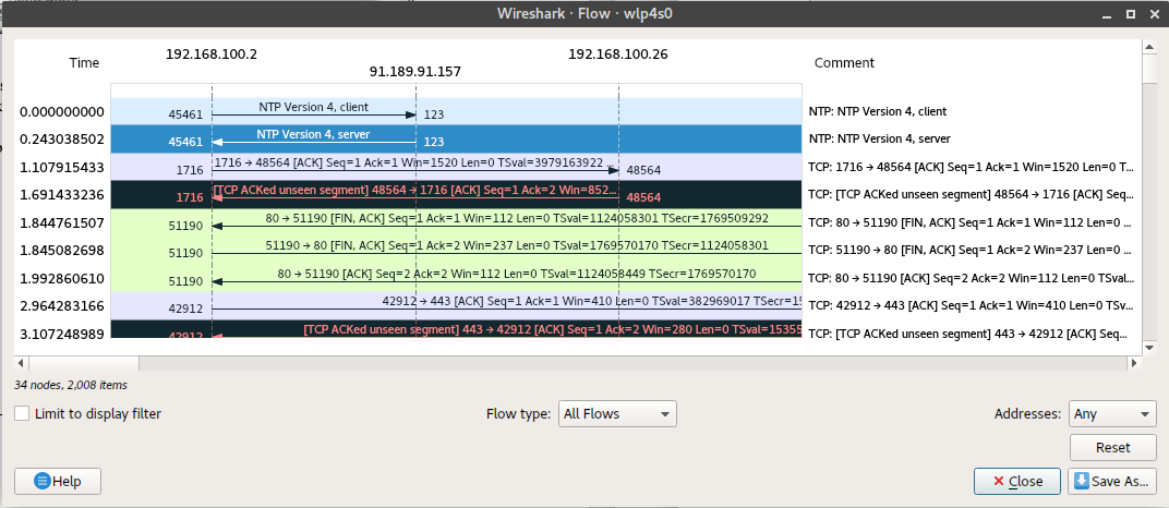 These provide us with a column-type graph, which shows which we can use to troubleshoot dropped connections, lost frames, re-transmission traffic and much more. We can be able to export these results into a text-based output. To create a flow graph, select “Statistics” then “Flow Graph.” Doing this, we were able to generate the graph below.