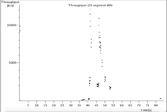 In the graph, the x-axis represents the time in seconds and the y-axis represents the throughput in bytes per seconds.