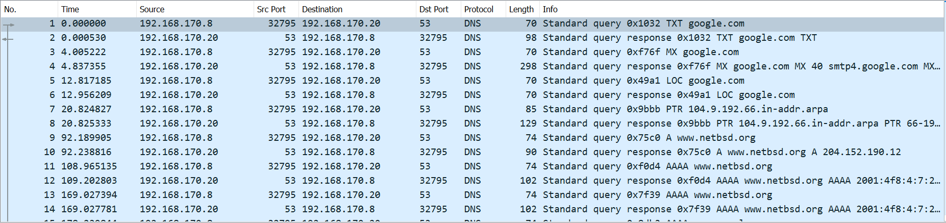 Wireshark makes DNS packets easy to find in a traffic capture. The built-in dns filter in Wireshark shows only DNS protocol traffic. Also, as shown below, DNS traffic is shown in a light blue in Wireshark by default.