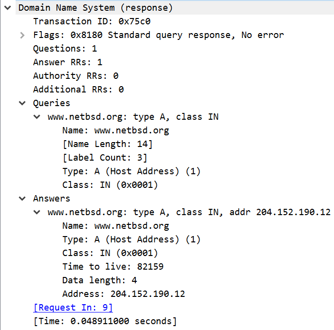 The images above show the structure of a simple DNS request and response. As shown at the top of the request packet, a single request can carry multiple queries. The request data structure informs the DNS server of the type of packet (query), the number of questions that it contains (one), and then the data in the queries. In this case, the request is for the A record for www.netbsd.org.