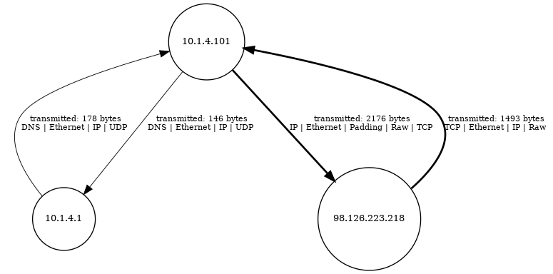 Based on this diagram, it appears that the IP address 10.1.4.101 made a DNS request to 10.1.4.1 and also communicated heavily with 98.126.223.218. It is possible (but not certain) that the DNS request made of 10.1.4.1 resolved to the 98.126.223.218 IP address.
