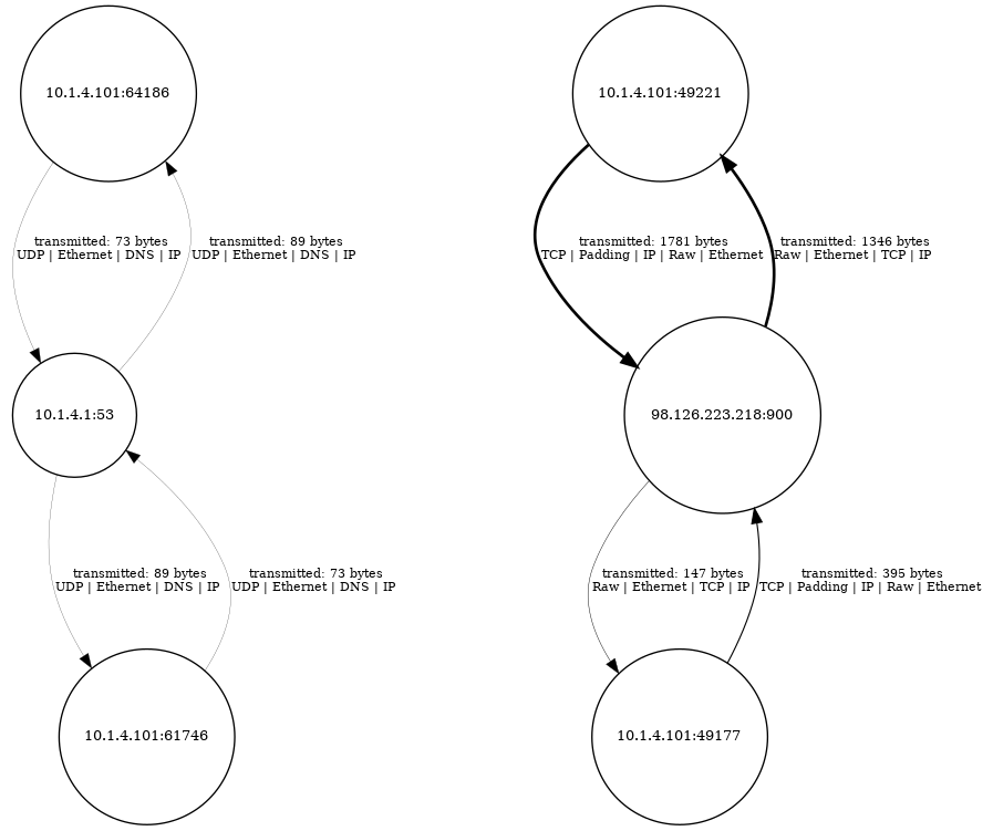 For example, the left half of the map shows that 10.1.4.1 is a DNS server (based off of the fact that it’s operating on port 53). The right half of the map demonstrates that a machine is communicating on two different ports with 98.126.223.218 on port 900. Since 900 is not a standard port for a server, this may indicate a command-and-control server for malware. The affected machines should be investigated for possible infection, and the organization may wish to add the domain that is requested and resolves to 98.126.223.218 to a DNS blacklist.