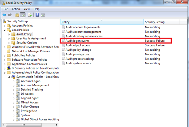 To check for brute force pattern, I have enabled auditing on logon events in the Local Security Policy and I will be feeding my System Win:Security logs to Splunk to check for a brute force pattern against local login attempts.