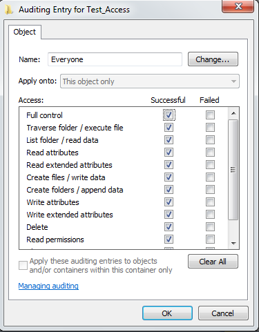 Enabling auditing on security policies is not enough, and now I have to enable the auditing on the respective file, also named "Test_Access" in this case. I have enabled auditing for Group Name –"Everyone" on this file. Organizations should fingerprint all the sensitive files and corresponding privileges and user group access on them.