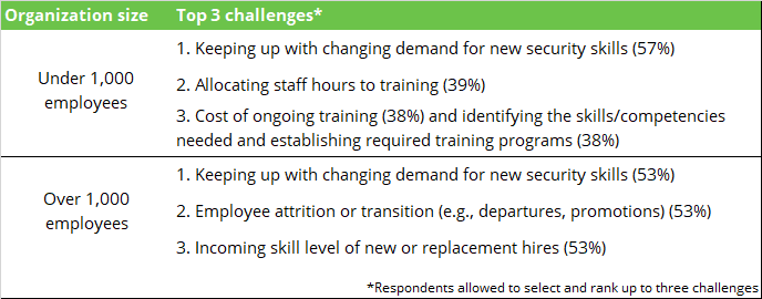 • Large organizations impacted more by employee attrition: Following “keeping up with the changing demand for new security skills,” the top-ranked employee development challenges at large organizations directly correlate to employee attrition and transition. This may be due to two factors: