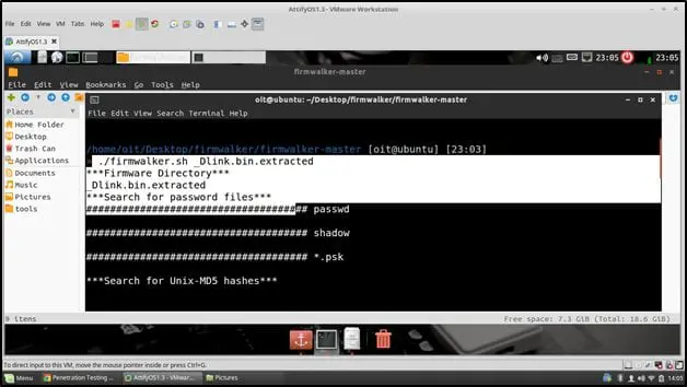 - Run Firmwalker – Once the files are extracted, we need to run Firmwalker over it. Firmwalker will scan all the files present in the firmware and look for the vulnerabilities listed above. The only prerequisite is the extracted firmware file, and Firmwalker should be present in the same folder. Once the scanning is done, Firmwalker generates the output in a file name Firmwalker.txt by default. This Firmwalker.txt file contains the list of vulnerabilities which were found in the firmware.