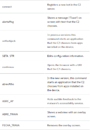 The trojan communicates with its C2 server during the infection operation based on commands observed on other Brazilian trojans. The complete list of commands is presented below.