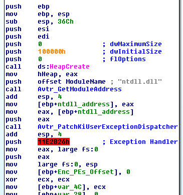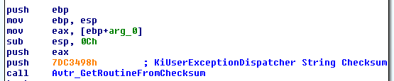 We see a function "Avtr_PatchKiUserExceptionDispatched" being called. I named it exactly after what it does, which is installing a hook on KiUserExceptionDispatcher. Briefly, the execution is switched to KiUserExceptionDispatcher whenever an exception occurs. This leads to invoking another routine "RtlDispatchException" responsible for calling the registered exception handlers and so on. What Avatar does is patch the call to RtlDispatchException to divert the execution to its own routine (Avtr_RtlDispatchException). Below are the relevant parts of this process: