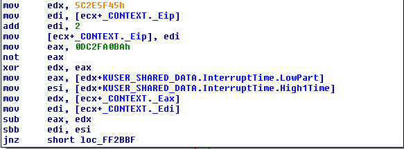 We can see that a similar technique to GetTickCount is used here as an anti-debugging technique. Next, the processor context of the frame that threw the exception is used to get EAX and EDX where the InterruptTime is stored. Moreover, the context's EBP is used to get stack pointers to variables (ntdll_address, NtAllocateVirtualMemoryChecksum, and Mem).