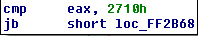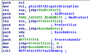 We see in the last chunk of code that EIP is moved right after the instruction that caused the exception (EIP + 2 => jmp edx). EDX is then set to contain the address of NtAllocateVirtualMemory. Moreover, since it is a jump, a return address must be present at the top of the stack (loc_D726D5). Furthermore, the value at (Mem+0x18) that was incremented earlier is now back to zero. This field always receives one before testing for a debugger or a VM, and it is zeroed back if the tests succeed.