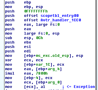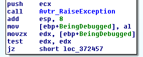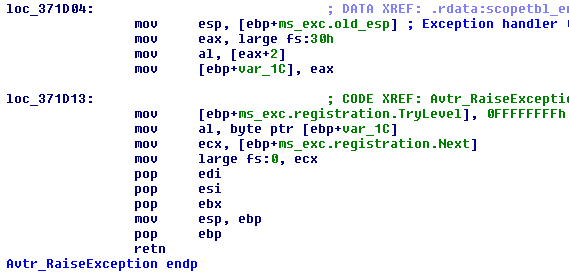 Avtr_handler_1CC0 is responsible for executing the exception filter and handler inside the scope table entry provided. The handler at loc_1231D04 reads the well-known BeingDebugged flag into a local variable after setting ESP to its old value before the exception (Figure 4).