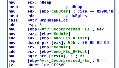 Subsequently, Avtr_DecompressSourceToDest is invoked which results in the decompressed data stored in the location pointed by Avtr_Decompressed_PEs. A memory chunk of size 4448 bytes is allocated and zeroed afterward; we will call it Mem. (Mem+0x18) is then incremented for reasons we will discuss later. Right after that, certain values are pushed onto the stack in the following fashion: