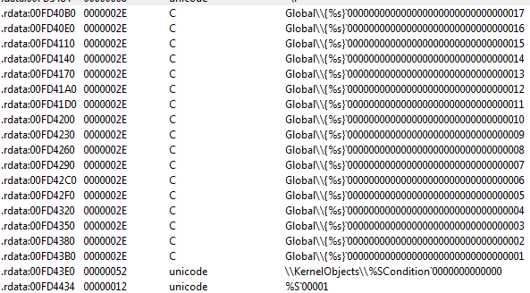 After the dropper is done with structure initialization, it starts generating random strings that are names for the malware's mutexes, a kernel object, a random 6-bytes string and also two random 4-bytes values. This randomization keeps the malware from being detected as it would normally when using hardcoded global mutex and event names.