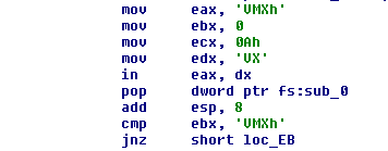 Another anti-VMware technique used is the famous IN instruction trick. Supposing the sample is running on VMware, the execution of the IN instruction will make EAX and EBX hold VMware's version and 'VMXh' respectively. In normal cases, an exception will be raised since the IN instruction is privileged. That is why, before executing any of this code an exception handler is set up. This handler will immediately recover the previous stack pointer and return execution to the caller with a success "return value" (CF = 1).