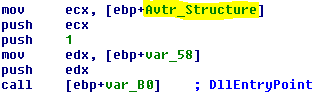 Figure 4 also shows a call to Avtr_RestorKiUserExceptionDispatcher which restores the original call offset of RtlDispatchException, and a call to Avtr_DecryptAndSwitchToDLL. What this routine does is load the DLL which was decompressed separately and then invoke its DllEntryPoint (Figure 5).