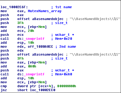 After that, a function is invoked that determines which version of Windows the user is running. Then, the module path that was stored earlier to Mem+0x120 is duplicated to Mem+0x328. The next block of code copies the 1st and 2nd mutex names, both preceded by BaseNamedObjects, to Mem+0x20 and Mem+0xA0 respectively (Figure