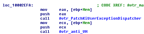 The code executed subsequently will patch the call to RtlDispatchException in the KiUserExceptionDispatcher routine as was done in the 1st level dropper. Then, Avtr_anti_VM will check if the malware is running in a virtual machine or not (Figure 8).