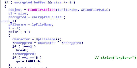The code that performs anti-VM checks is encrypted. Before being decrypted, it is copied the previously allocated memory region at *(Mem+0x1C) (refer to the pseudocode at the beginning of the article). Then, it is decrypted using a simple cyclic XOR algorithm with the string "explorer" (Figure 9).