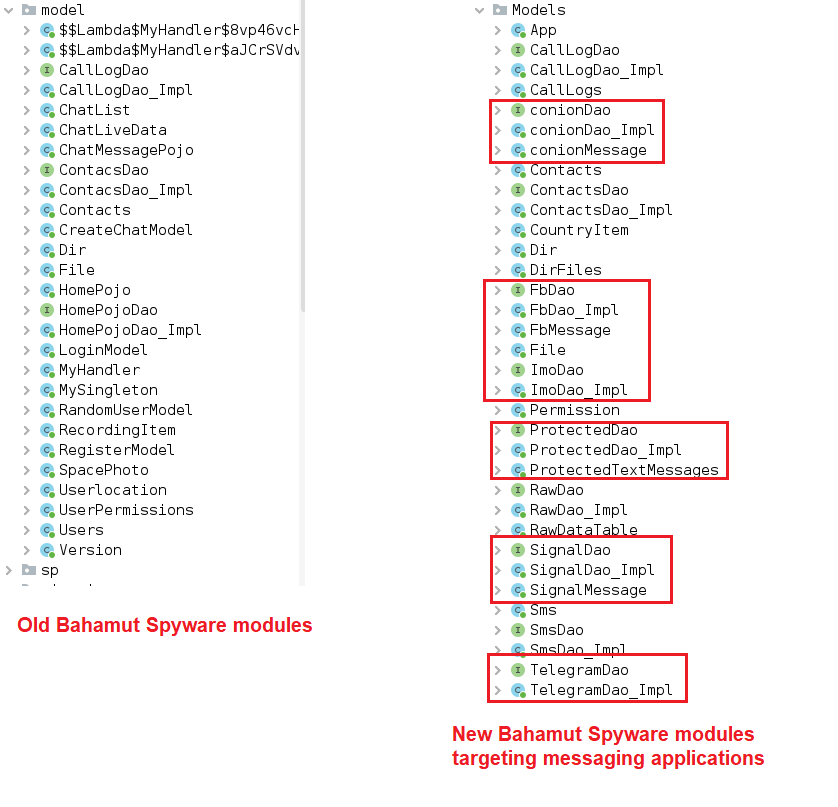 Figure 5: Similarities between the Bahamut Android Spyware sample modules and the new Android package file distributed in 2022 (source).