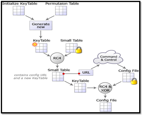 The configuration files are hidden and also encrypted with RC4 cipher. Each RC4 key is specific to a bot and is stored within the encrypted executable.