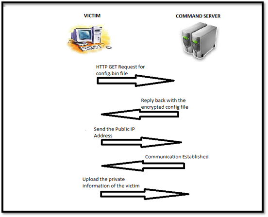 Once the clients are infected, they communicate with the command server through HTTP GET messages. This is mainly required to download the configuration file of the botnet on the victim system and then perform actions as per the settings of the configuration file. Once the bot communicates with the command server, it replies back with the encrypted configurations file, mainly config.bin. This encrypted file is decrypted at the client end by the bot (using its secret key), which then parses the configuration file. Once the configuration file is setup, the bot sends its gateway IP address (public IP address) to the command server. Once the communication is set up and the bot joins up the botnet, it starts posting up the victim's private information on the assigned address from the configuration file. So all the financial information, credentials, and screenshots get uploaded to that secret address so they may then be used maliciously by the person running the botnet.