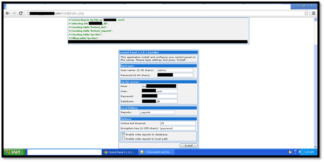 So we start by setting up an account on a web hosting and creating a Mysql database, username and password. Then we move on to the index.php file under the path /install/index.php. We make the minor changes in the code to provide information such as the username and password for Zeus, mysql host, username and password, and a botnet crypt key. Here is a screenshot showing the same: