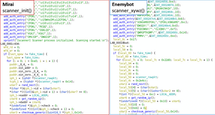 Figure 2: Code similarities between Mirai and Enemybot (source)