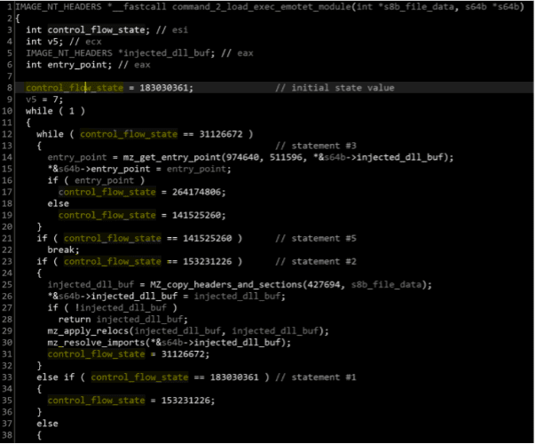 The DLL is equipped with a module of anti-revere engineering to make its analysis difficult. One of the techniques is that the control flow structure is partially removed. In the following image from Zscaler analysis, it’s possible to see a randomized variable that is used as a “control_flow_state” along with several loops, if and else conditions, or other structures to make its analysis difficult.