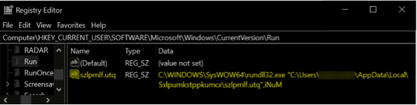 A simple method was introduced to persist the threat: a DLL file dropped into the start-up folder and loaded via Windows Registry. After executing the first time, the DLL creates a random file name and stores a copy into the C:\ProgramData path. After that, it is moved to a random directory under the AppData\Local folder. As observed below, the DLL persists via a Windows registry added during the malware execution.