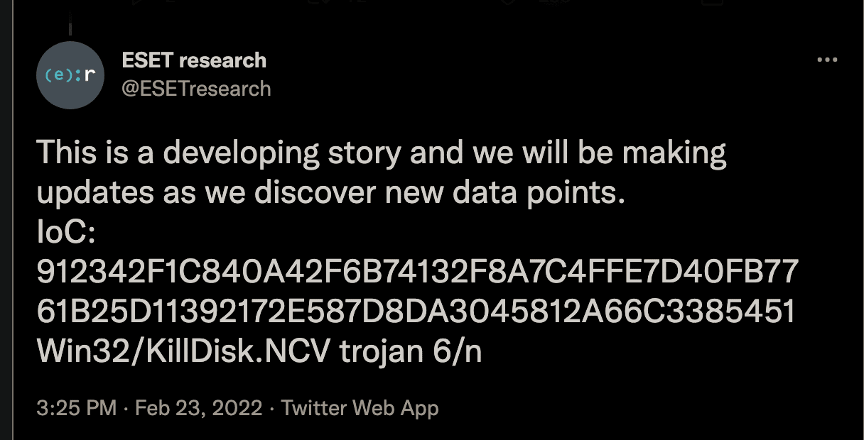 Figure 1: Tweet by ESET reporting the malicious IoCs related to the HermeticWiper (source).