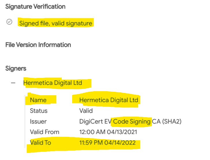 This malware tries to bypass some security features by using a legitimate certificate by Hermetica Digital Ltd. The name of the malware is directly related to this finding.