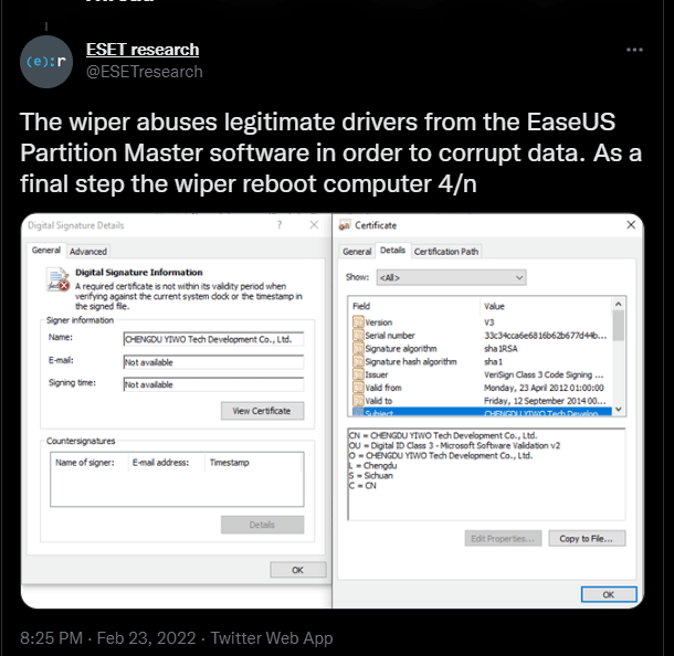 Figure 4: Drivers dropped by HermeticWiper and addressed by ESET on Twitter.