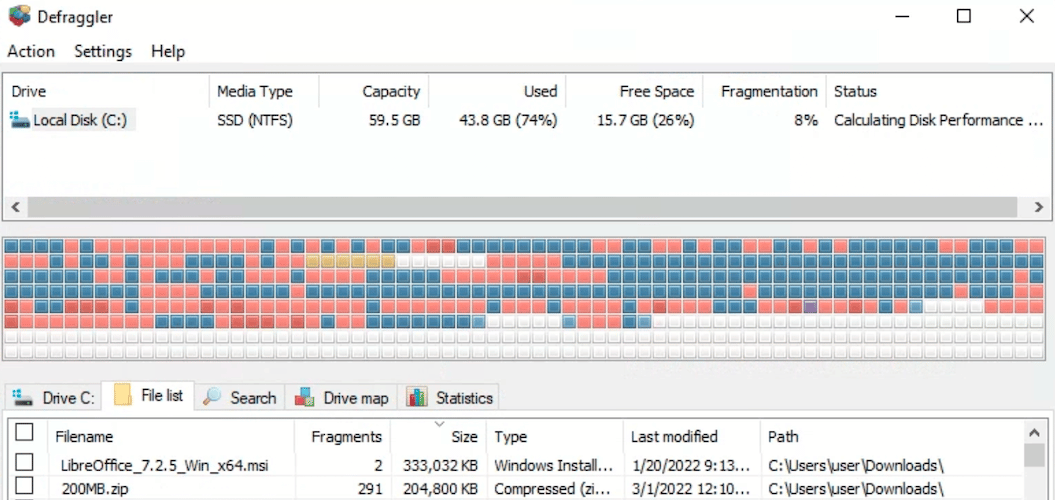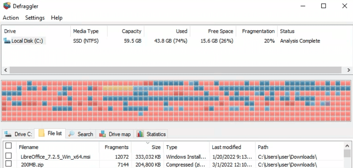 The next image shows the status of the disk data fragmentation before and after the malware execution.