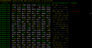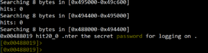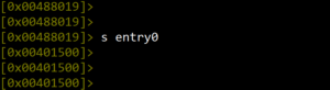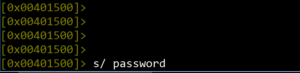 During binary analysis, we can jump to any section within the binary code. The “s” command in radare2 is used to “search” for data within the code. As shown in Figure 8, it is used to search for the key “password” within the code. Note that the address changes from the entry point 0x00401500 to the address where the key is found: 0x00488019. Running the command s entry0 at any time will return us to the starting address 0x00401500 shown in Figure 10.