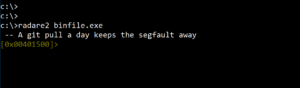 To begin with reversing, we launch radare2 and load a binary file named binfile.exe.