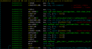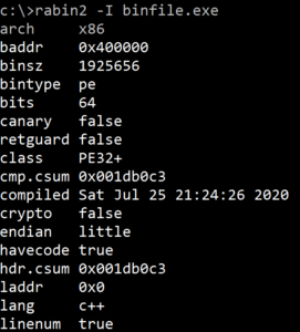 rabin2 provides key information about executable binaries. It is mostly known as a binary program info extractor. As shown in Figure 4, we see that the executable binary under observation will run on x86 architecture and has a bin type in the Portable Executable (PE) format. We also see that this binary was coded using C++.