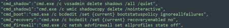 Figure 10: Operations performed by Ragnarok during its execution. The shadow copies are deleted, and Windows Defender and firewall are disabled.