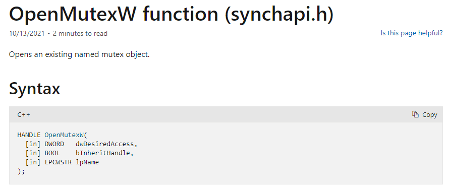 For example, by intercepting the "OpenMutex()" Windows call, we can analyze the name of the opened mutex if the malware executes that function during run-time. According to Microsoft, the "lpName" parameter (position 2) has the name of the mutex to be opened.