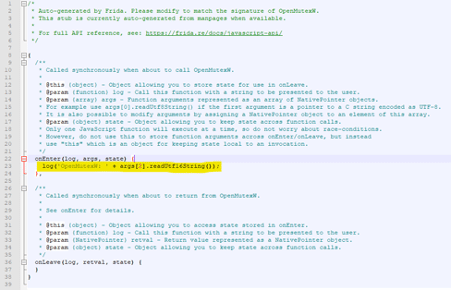 log('OpenMutexW: ' + args[2].readUtf16String());Figure 2: Line of code responsible for writing the second parameter of the OpenMutex call on the console during run-time (source).