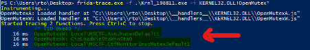 After executing the Frida-trace again with the same parameters, it will read the changes from the JavaScript file and write the result on the console. As observed, the name of the opened mutexes is listed.