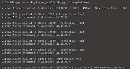 As demonstrated below, tracing the memory injection technique is possible with an initial script. In detail, the "VirtualAlloc" and "VirtualProtect" Win calls are monitored, and their content is shown when triggered.