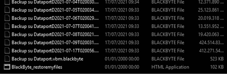 All the damaged files have the" .blackbyte" extension associated. For instance, the file "a.txt" is renamed to "a.txt.blackbyte" and so on.