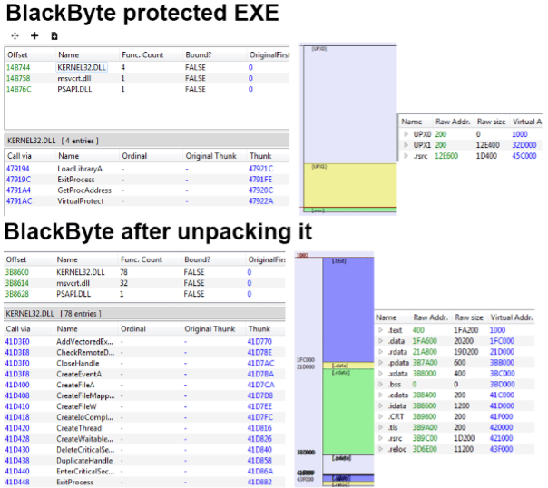Figure 5: Packed vs. unpacked BlackByte ransomware sample.