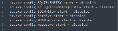 The list of disabled services and all the hardcoded processes to terminate can be found below.