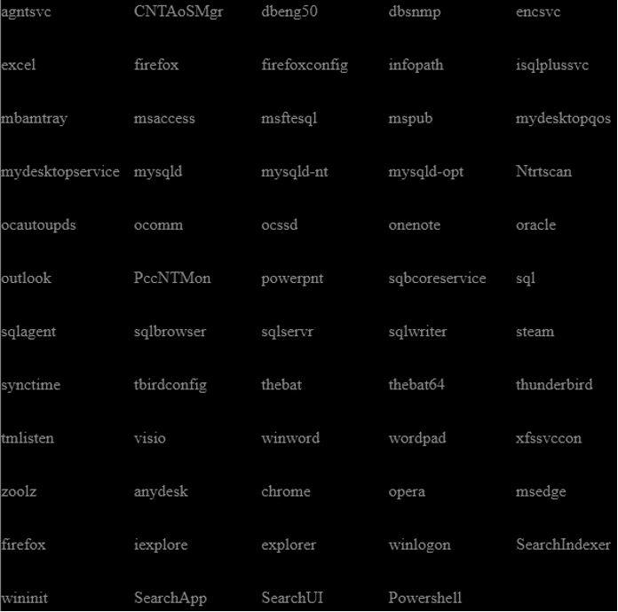 Figure 8: List of all the processes terminated during the BlackByte ransomware execution.