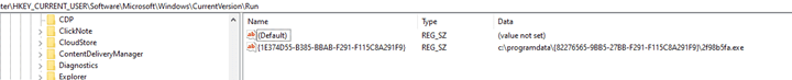 • Creates persistence under a new folder in C:\ProgramData path and drops a new EXE file (the 1st stage again).