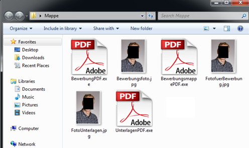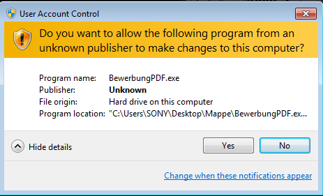 When the victim opens BewerbungPDF.exe, for example, he is prompted to run it as an administrator.