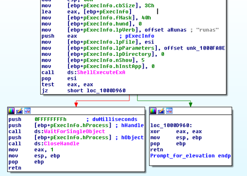 When the user clicks yes, the new privileged process starts executing ( it starts by unpacking, loading the DLL then finding that the token is indeed privileged and finally taking the low-level disk encryption code path) while the current process waits infinitely until the privileged process is terminated. However, if the user doesn't choose to run the process as administrator, the function returns 0 which means that Mischa will run.
