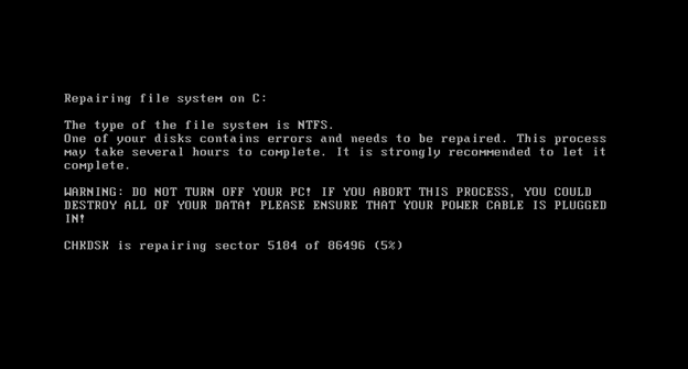 Petya BSODs the system using NtRaiseHardError and tricks the victim into thinking that CHKDSK is repairing the disk.